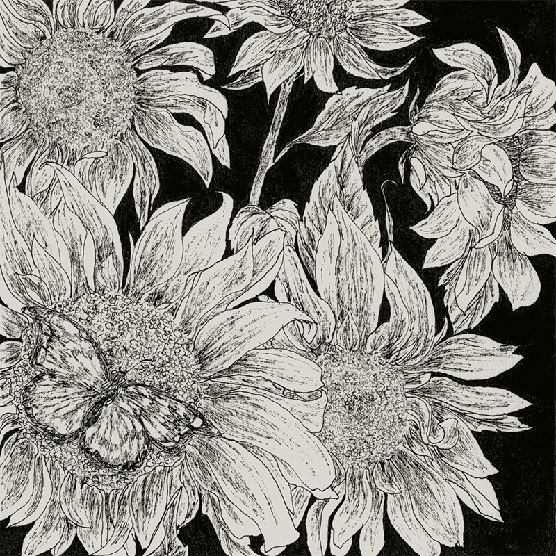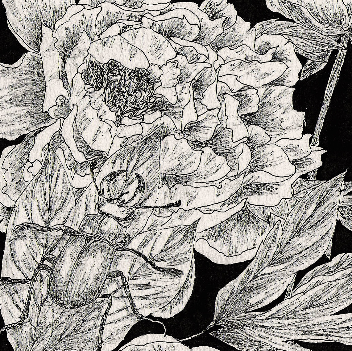 Flowers and insects, 2019: Cosmos // Peonies & horned beetle // Clematite // Scabiosa // Sunflowers & butterfly